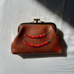 Shes a mighty 5.5 inches wide and 4 inches tall. Functional metal clasp opening up to 2 compartments perfect for seperating coins from cash, joints from lighters, hot sauce packets from candy, etc., Comprised of vegan leather because hello I am a vegetarian animal chica I like to save the cows. However I will never compromise quality for price therefore these pouches have demonstrated to be great quality, hold the paint extremely well, and didn't kill any cows in the making:)